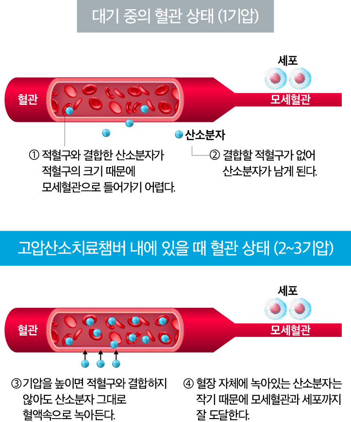 고압산소치료는 대기압보다 높은 2~3기압의 인위적인 환경을 만들어