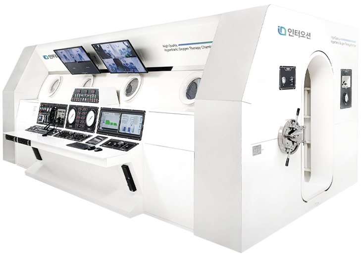 고압산소치료는 대기압보다 높은 2~4기압의 인위적인 환경을 만들어 고순도산소(100%)를 흡입함으로써 얻어지는 용해성 산소를 통하여 인체 내의 산소 농도를 높이고 저산소증을 개선하는 치료법입니다.